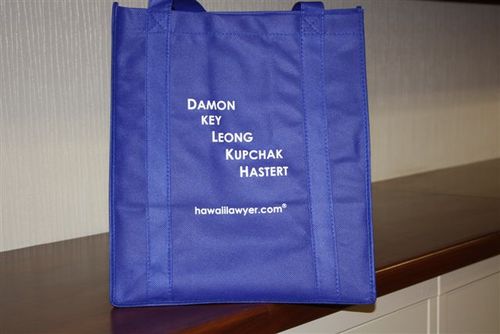 If you don’t already have your own bags to bring with you (so you can avoid paying the $.10 for the paper bag which the stores will provide), we are here to help you out. You can save yourself the embarrassment of carrying out all your stuff in your arms or in an old box like when you go to Costco, by obtaining one of our firm’s reusable eco-friendly bags.