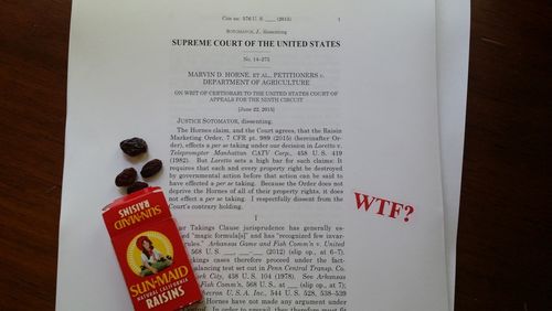 A Supreme Court win is a win, particularly by a margin of 8-1, so we’re not going to complain too much about the Court’s opinion in Horne v. Department of Agriculture, No. 14-275 (U.S. June 22, 2015), holding that the USDA’s requirement that raisin producers physically turn over a percentage of their yearly crops to the government without being provided compensation is a taking in violation of the Fifth Amendment.