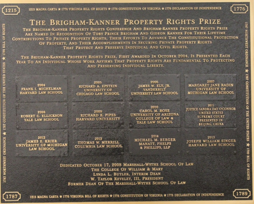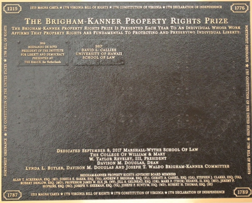 University of Hawaii Law School Professor David Callies last night was presented with William and Mary Law School’s Brigham-Kanner Property Rights Prize which is “presented annually to a scholar, practitioner or jurist whose work affirms the fundamental importance of property rights.”