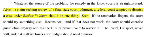 You remember the Rooker-Felman doctrine (named after the two Supreme Court decisions which defined its contours), right? All it says is that U.S. District Courts do not have appellate jurisdiction to review final judgments of state supreme court. That’s it. But thanks in part to an article by a law school mentor of ours (Williamson B.C. Chang, Rediscovering the Rooker Doctrine: Section 1983, Res Judicata and the Federal Courts, 31 Hastings L.J. 1337 (1980)), the doctrine was read much more