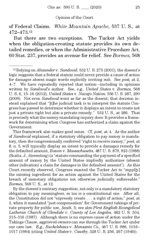 But what does this mean, exactly? Even as the Sixth Circuit recognized that property owners have a right to compensation that springs from the Constitution itself and the right to sue does not depend upon a waiver of sovereign immunity, it held that Congress is not compelled to provide an Article III forum to vindicate that right. Or indeed, any forum at all. Thus, even if the forum Congress created―the Article I non-jury Court of Federal Claims (CFC)―is not constitutionally adequate, well, that’s good enough. In the words of the Sixth Circuit, “[t]he Fifth Amendment details a broad right to compensation, but does not provide a means to enforce that right. Courts must look to other sources (such as the Tucker Act and the Little Tucker Act) to determine how the right to compensation is to be enforced.” Brott v. United States, 858 F.3d 425, 432-33 (6th Cir. 2017). That is sovereign immunity by another name.