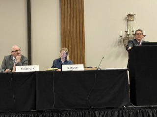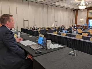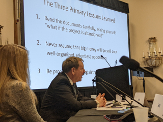 Below, Michael Berger (looking a bit like Big Brother, admittedly), who remoted in from California with his annual “Regulatory Takings Update.”