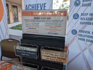 Tag swag (aka badge flair) courtesy of our Platinum sponsor.
