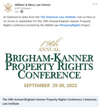 We spoke on the second panel of the day at the 2022 Brigham-Kanner Property Rights Conference at the William and Mary Law School. The subject of our panel — which included Professors David Callies, Tim Mulvaney, and Dave Owen — was “Reshaping the Framework Protecting Property Under the Roberts Court.“