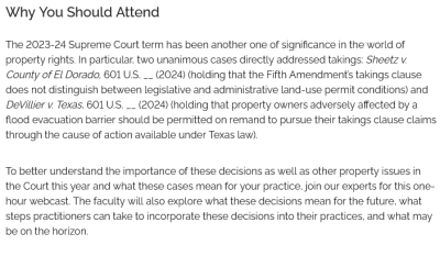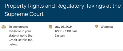 Mark your calendars and register now for the upcoming American Law Institute-CLE webinar “Property Rights and Regulatory Takings at the Supreme Court.” The focus of this program is a summary and analysis (including “what’s next?”) of the two big property and eminent domain cases decided by the U.S. Supreme Court, Sheetz (exactions), and Devillier (just compensation remedy).